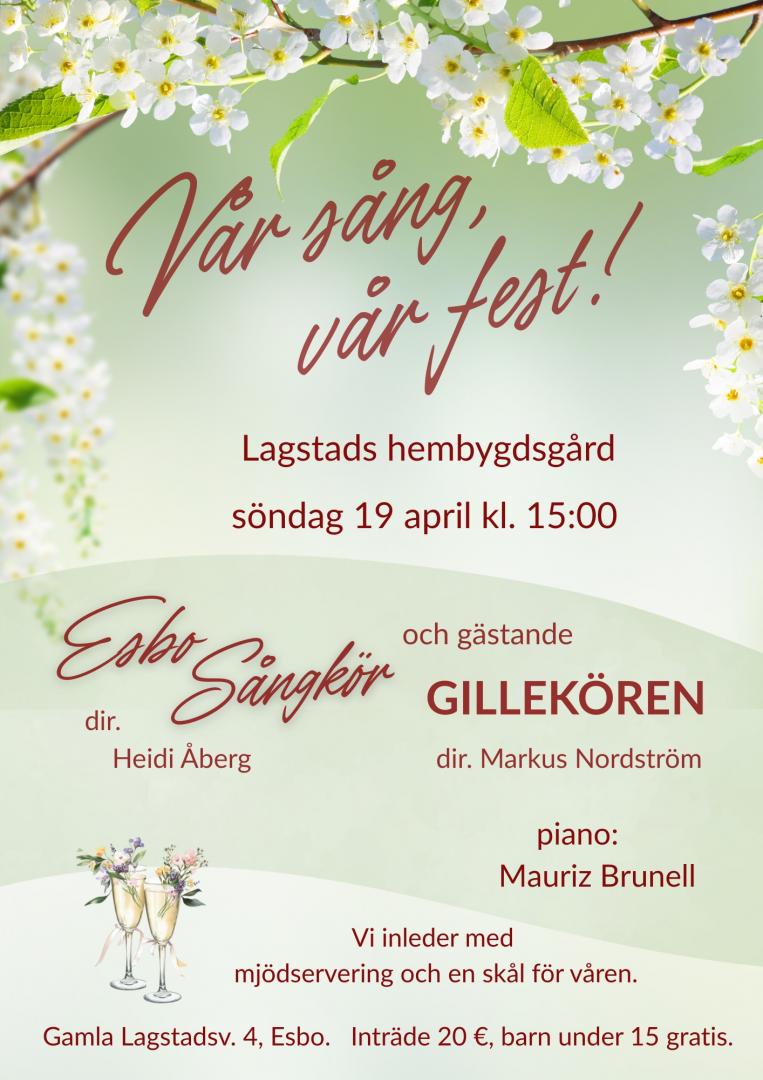 Söndagen den 19 april bjuder vi till vårkonsert "hemma" på Lagstads hembygdsgård, och med oss på scenen har vi gästande Gillekören från Helsingfors. Kom med och fira våren med ljuva toner och ett glas mjöd! Repertoaren kretsar i huvudsak kring sånger – delvis nyskrivna – som ska sjungas på den stora finlandssvenska sång- och musikfesten, som fyller Helsingfors centrum med glada sångare och musiker andra veckoslutet i juni.