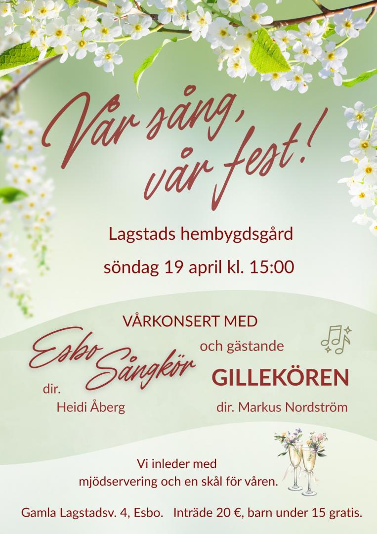 Söndagen den 19 april bjuder vi till vårkonsert "hemma" på Lagstads hembygdsgård, och med oss på scenen har vi gästande Gillekören från Helsingfors. Kom med och fira våren med ljuva toner och ett glas mjöd! Repertoaren kretsar i huvudsak kring sånger – delvis nyskrivna – som ska sjungas på den stora finlandssvenska sång- och musikfesten, som fyller Helsingfors centrum med glada sångare och musiker andra veckoslutet i juni.