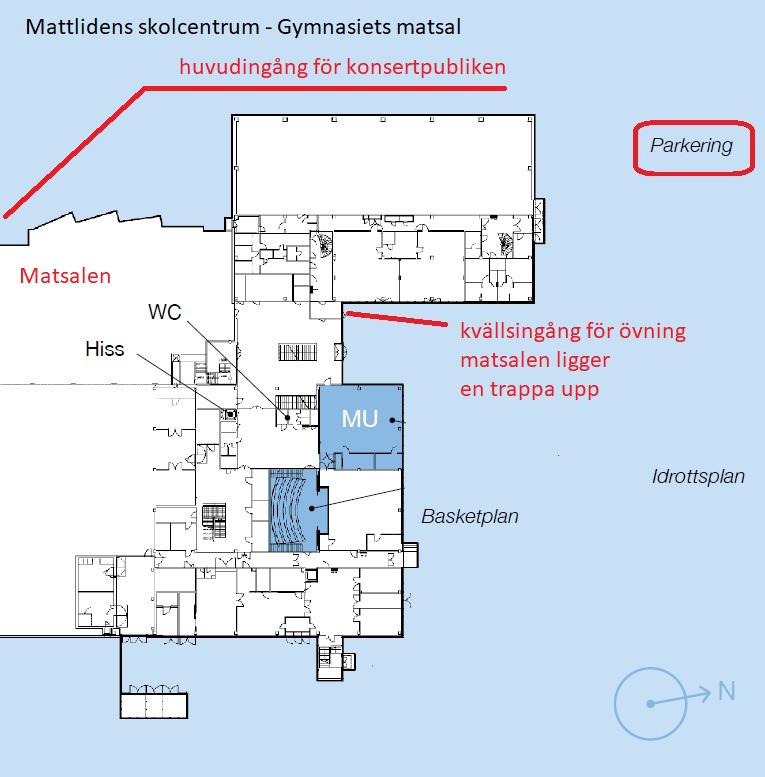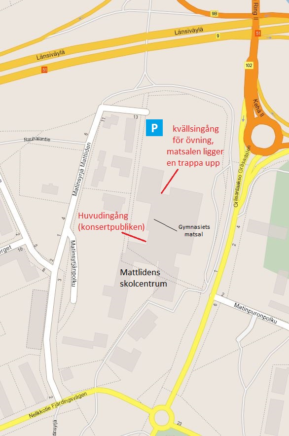 Norr om skolkomplexet finns en rymlig parkeringsplats som man når via Fjärdingsvägen och Mattliden.