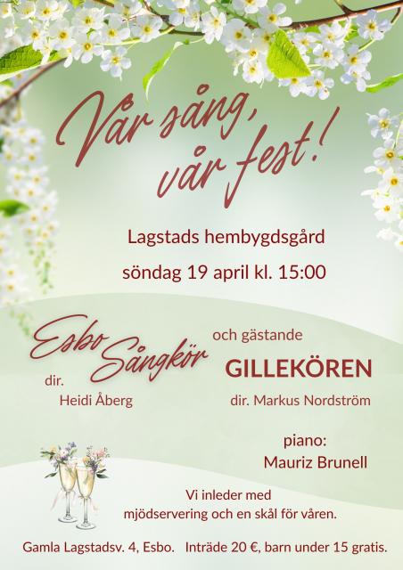Vårkonsert i Mattlidens skolcentrum söndag 24.4.2022 kl. 16:00 med Esbo Sångkör, dir. Barbro Smeds, och gästande Kammarkören Idun, dir. Karin Pedersen. Vid pianot Mauriz Brunell.